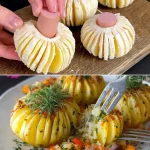 This Italian-inspired potato dish offers both visual appeal and nutritional value. Potatoes provide complex carbohydrates for sustained energy, along with potassium for heart health and vitamin C for immune support. The hasselback cutting technique increases surface area, creating maximum crispiness while using less oil than traditional deep-frying methods. The sausage adds protein and savory flavor, making this a complete meal. The colorful vegetable medley contributes vitamins A and C from the bell peppers and carrots, lycopene from the tomatoes for heart health, and additional fiber for digestive wellness. Fresh herbs like dill and green onions provide antioxidants and enhance flavor without added sodium. By pan-frying then oven-finishing, this method achieves crispy exteriors and fluffy interiors while controlling fat content. The combination of protein, complex carbohydrates, and vegetables creates a balanced, satisfying meal that’s both comforting and nourishing.